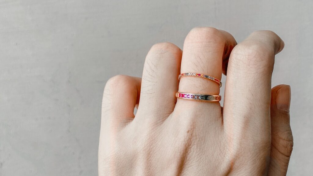 色違いのリングを組み合わせて重ね付けしたい時は、同じデザインのリングの色違いだとまとまり感や上品さが演出出来ます。逆に太さもデザインも違う素材違いのリングを隣同士にすると、メリハリが出てクールな印象になるでしょう。少しパンクな感じを出したい時にもおすすめの付け方です。質感なども統一すると、よりまとまり感が生まれます。