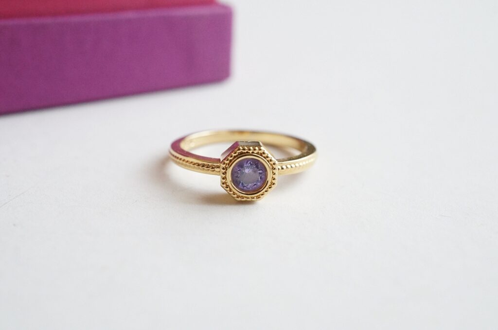 「宝石の王様」と呼ばれるアレキサンドライトをあしらったリングです。発見されたアレキサンドライトは、当時のロシア皇帝ニコライ1世に献上。偶然その日が、後のアレキサンダー2世の12歳の誕生日だったため、この名前がつけられました。まさに「宝石の王様」の異名を持つのにこれ以上ないほど相応しい宝石です。
